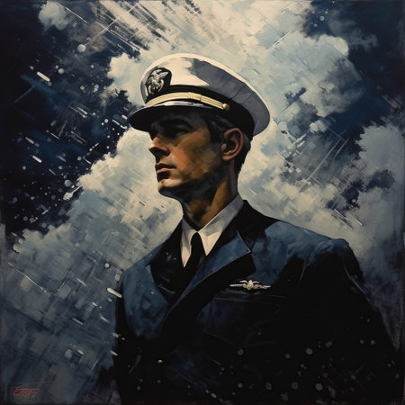 A solemn male naval officer gazing at the turbulent ocean, dressed in a dark uniform, conveying emotions of determination and resilience against a stormy background