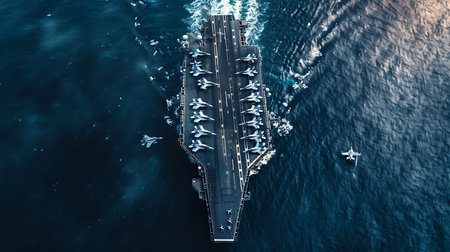 Aerial view of a massive aircraft carrier surrounded by the deep blue ocean, with fighter jets parked on the deck. The ship leaves a foamy wake as it sails through the water under the clear sky.