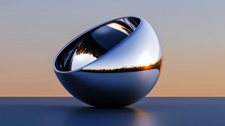 Mirrored sphere reflecting sunset over calm ocean at sunrise