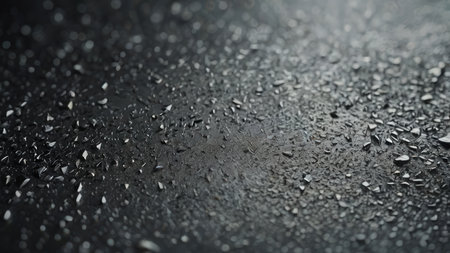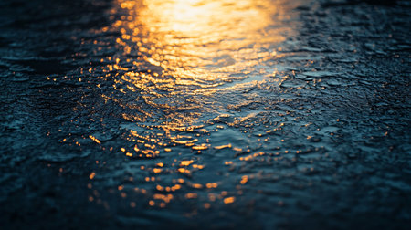 High-detail macro image of a wet cement surface, showcasing natural texture and depth. Sunlight reflections and motion blur add dynamic realism to the scene.