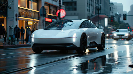 Futuristic Electric Car in Urban Rainy Night Scene