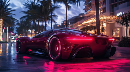 A sleek electric supercar parked in an upscale area, illuminated by vibrant neon lights. Palm trees line the path as the last rays of sunlight fade, creating an enticing atmosphere of luxury and innovation.