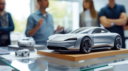A team of individuals is collaborating on designing and assembling a model car, using components like tires, wheels, vehicle body parts, lights, and mirrors. AIG41