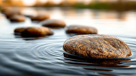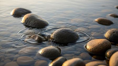 Close-up of rounded stones partially submerged in calm water, reflecting a soft, warm light. The image displays a natural, serene environment with blurred reflections. It presents a tranquil setting likely outdoors during daylight, suitable for various editorial and commercial applications. The composition emphasizes texture and natural beauty.