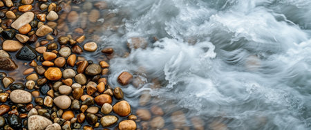 A close-up of river stones with water gently flowing over them, creating soft ripples and reflections in a tranquil outdoor setting