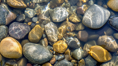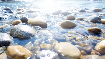 serene view of smooth stones submerged in clear water, reflecting sunlight and creating tranquil atmosphere. gentle ripples enhance peacefulness of scene.