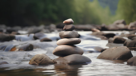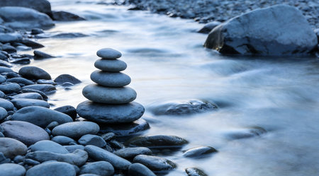 Zen stones delicately balanced on rock beside flowing river, symbolizing peace, nature harmony, and spiritual balance.