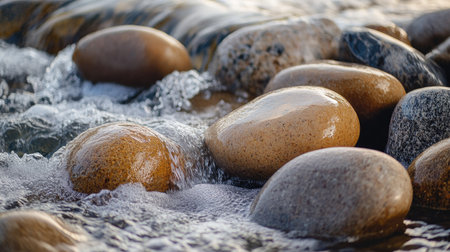 This image showcases a collection of smooth, rounded stones partially submerged in water. The scene is illuminated by warm sunlight, creating reflections and highlighting textures. The composition offers a close-up perspective, suggesting a natural environment. It could be used for various purposes, including website backgrounds or editorial content.