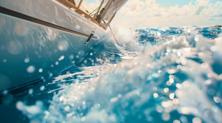 Close up low angle view of sailboat yacht in the ocean with a splash of water