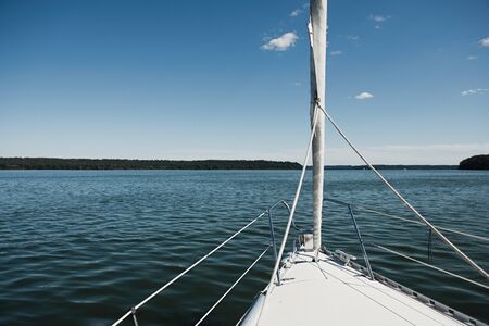 Front part of yacht swimming on lake. Beutiful Mazury lake photographed from yacht.