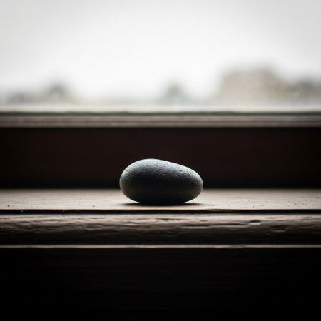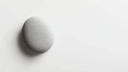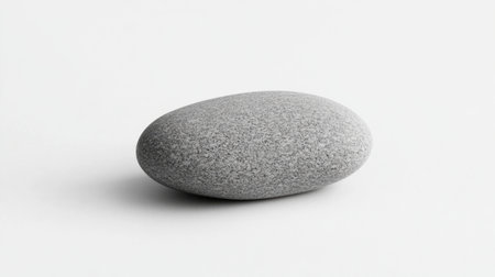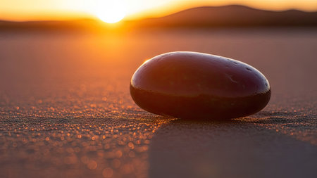 A unique rock sits on a textured surface illuminated by soft light creating a subtle shadow that enhances its natural beauty.