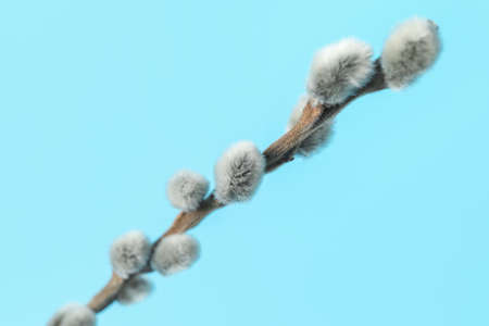 AI Generated. Blooming fluffy willow branches in spring close-up on nature macro with soft focus on turquoise blue background sky Vintage muted tones, copy space, ultra-wide format