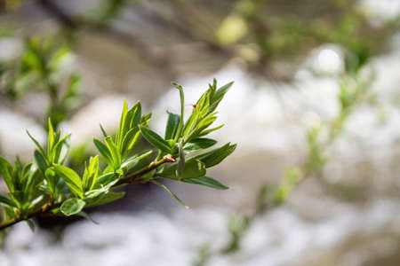 Nature awakes in spring. Blooming willow growing in a city park on a sunny spring day