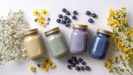 Four jars filled with pastel-colored smoothies are arranged on a white surface, accompanied by scattered blueberries and vibrant yellow flowers. The composition features an overhead perspective with bright natural lighting. Suitable for use in projects focused on healthy eating, recipes, or wellness themes.