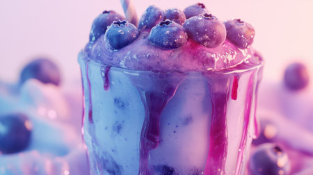 A blueberry milkshake in a frosty glass, topped with fresh blueberries and a drizzle of blueberry syrup, set against a white and blue background.