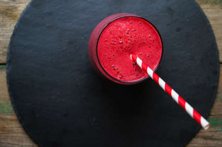 Glass with rasberry smoothie on the table, Selective focus