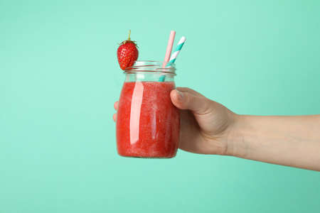 Female hand holds glass jar with strawberry cocktail on mint background. Summer drink