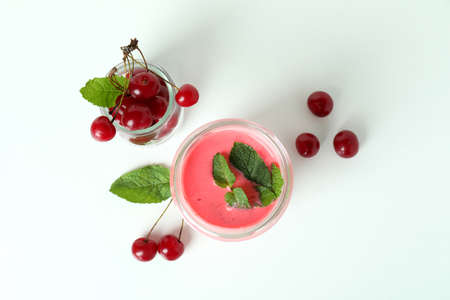 Glass jar of cherry smoothie and ingredients on white background