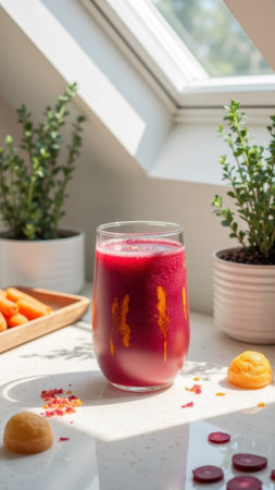 Refreshing beet and carrot smoothie in sunlit kitchen. That the image is generated using AI.
