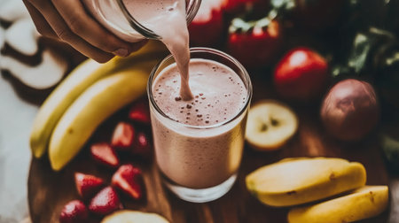 A juicy and colorful fruit smoothie being poured into a glass, with fresh fruits around it