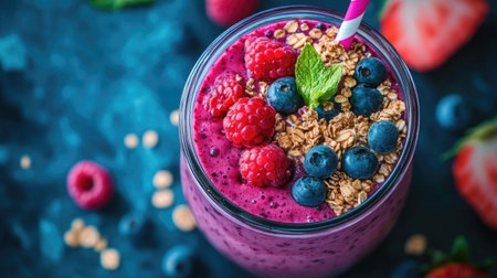 A vibrant berry smoothie topped with granola and fresh mint. Perfect for a healthy breakfast or a refreshing snack. Enjoy the burst of flavors!