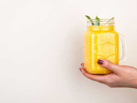 Woman hand holding orange smoothie shake with mint in the glass jar against beige wall.
