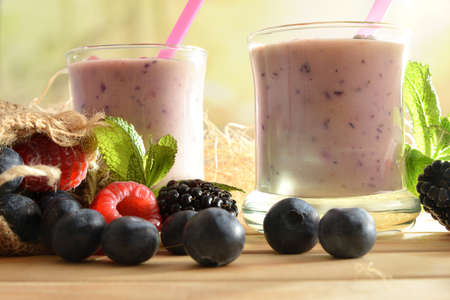 Forest berry yogurt smoothie in glass glasses on wooden table with sack full of blueberries, blackberries raspberries with green forest background close up ..