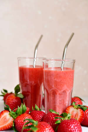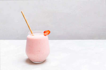 Fresh strawberry smoothie in a glass on a white slate, stone or concrete background.