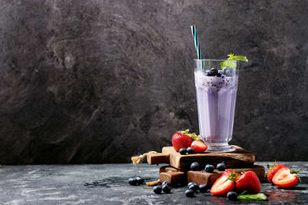 Fresh strawberry and blueberry milkshakes served with berries and mint over dark texture background