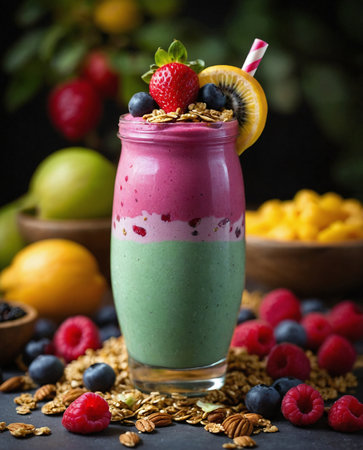 Healthy smoothie with blueberry, raspberry, kiwi and granola in a glass