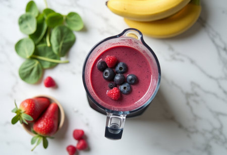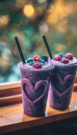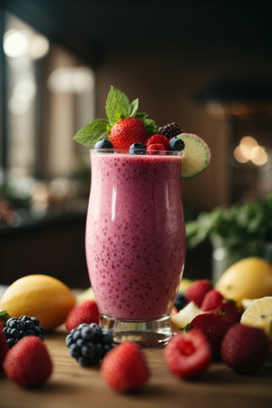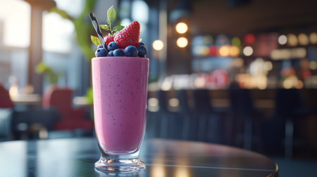 Delicious pink smoothie with strawberries and blueberries in modern cafe setting