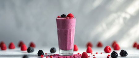 AI Generated. Refreshing berry smoothie served in a tall glass with raspberries and blackberries scattered around