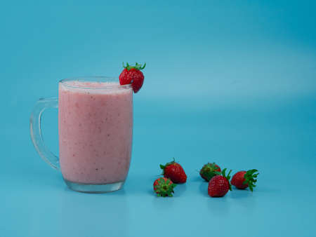 Strawberry milkshake juice in a glass on blue background. healthy fruit drink concept.