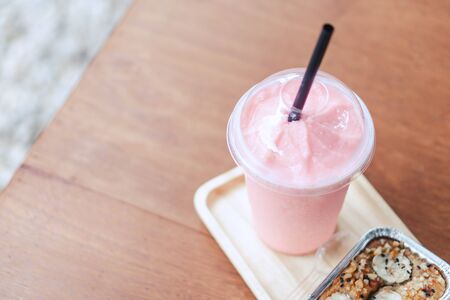 Closeup strawberry smoothie and cake with green nature background, selective focus