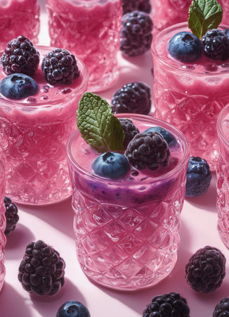 Delicious berry desserts sit in glass cups, showing vibrant pink hues topped with fresh blueberries and blackberries. Mint leaves add a touch of freshness.
