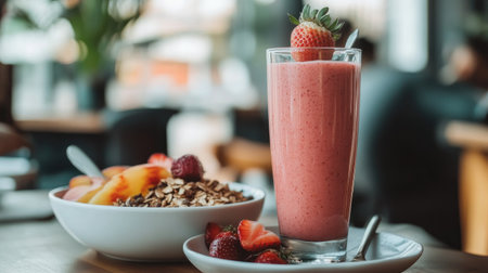 A vibrant smoothie alongside a delicious fruit bowl on a wooden table, perfect for a healthy breakfast or snack. Ideal for wellness lifestyle themes.