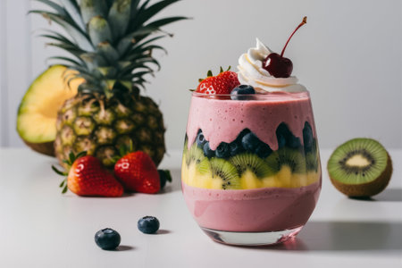 Closeup strwberry blueberry kiwi cherry smoothie glass with fresh fruits in background