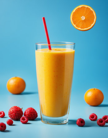 Orange smoothie with fresh citrus and berries on blue background