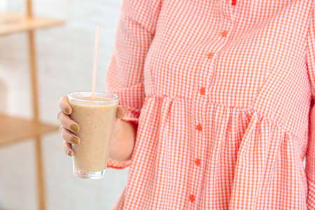 Woman with glass of healthy smoothie, closeup