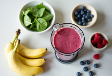 A vibrant smoothie made with fresh berries, spinach, and yogurt, served in a mason jar with a straw, placed on a rustic table.
