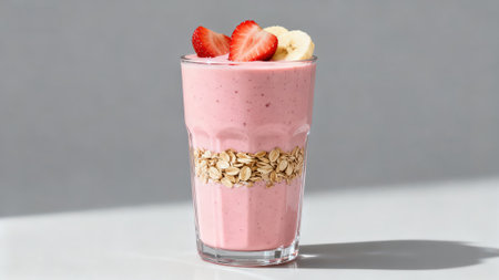 Strawberry smoothie with banana and oat flakes in glass