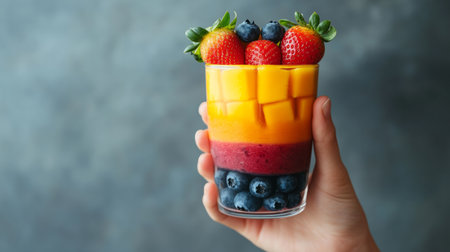 Hand holding a layered fruit smoothie with layers of mango, strawberry and blueberry. generative ai
