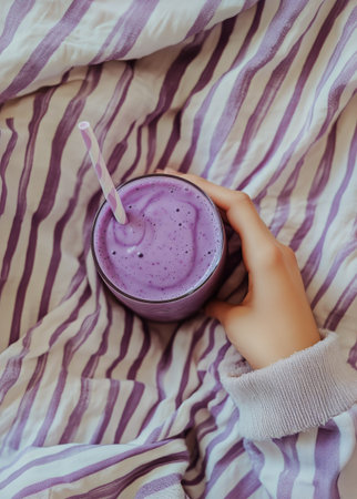A person holds a glass of purple smoothie while resting on a bed covered with a purple striped blanket. The atmosphere is relaxed and inviting.