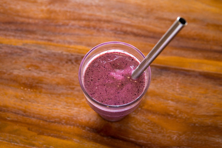 Mix berry smoothie with metallic straw on wooden background