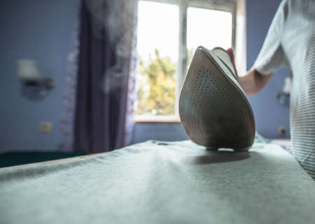 Homework. Close-up, woman ironing clothes with an iron on an ironing board after washing.