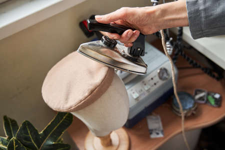 Female designer ironing hat at her workshop