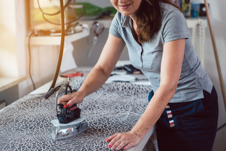 Woman ironing clothing in tailor shop