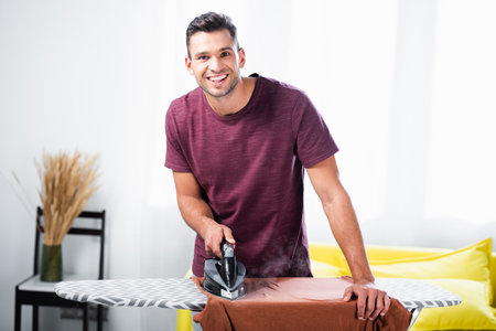 Cheerful man using iron while ironing clothes on board in living room