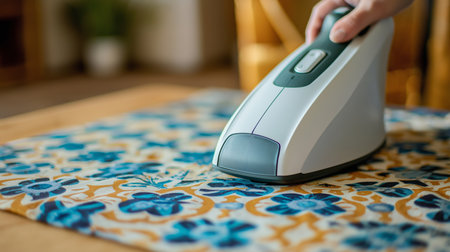 A hand operates a steam iron on a decorative cloth, enhancing its appearance and texture