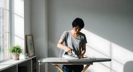 A woman stands at an ironing board near a large window, ironing a patterned garment. The natural light streaming in highlights the steam from the iron, depicting a typical domestic household chore.